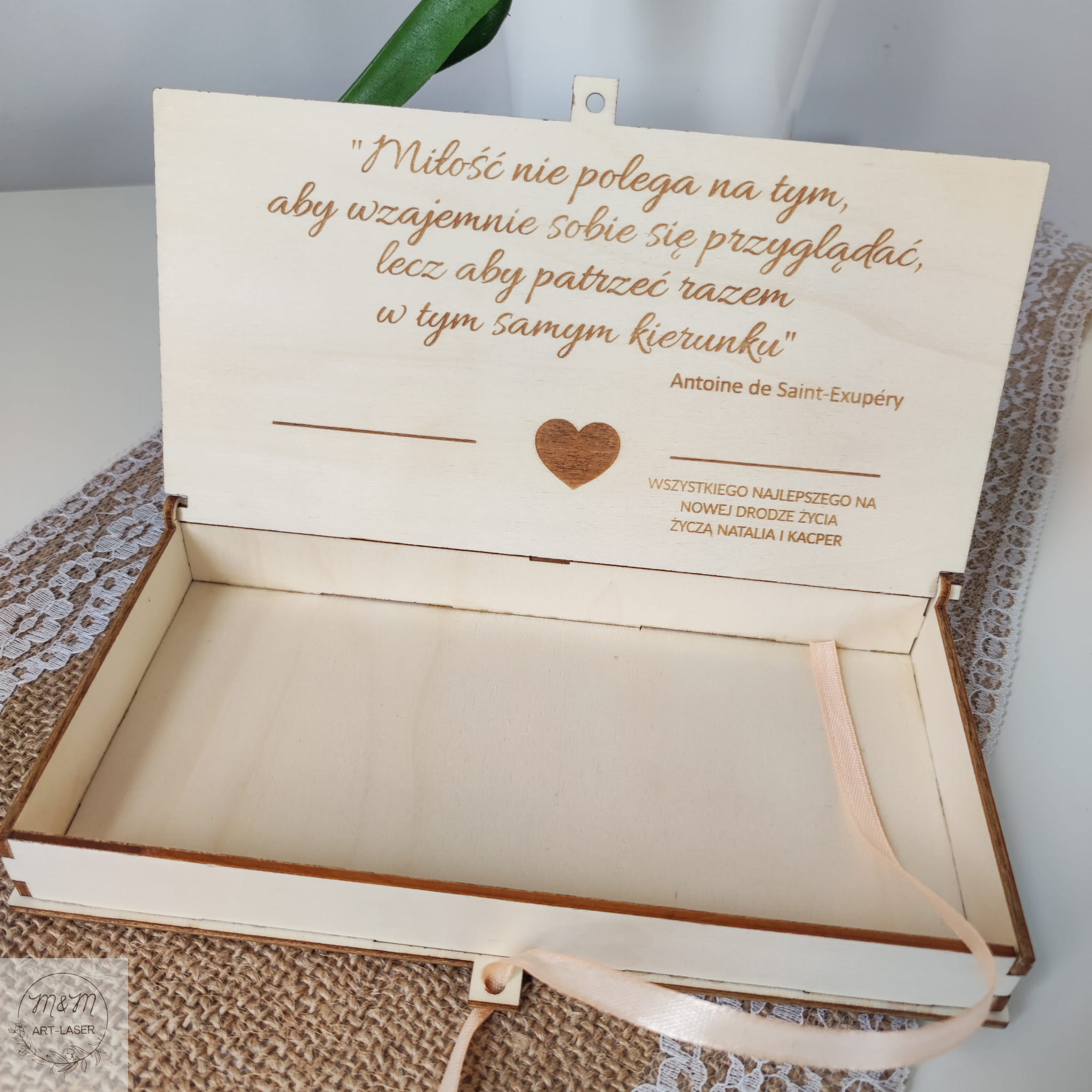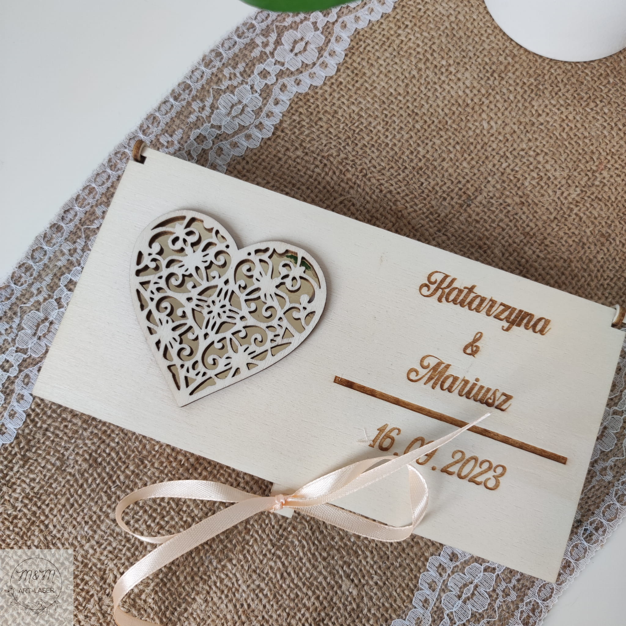 Na wieczku pudełka umieściliśmy serce – ponadczasowy symbol miłości. Serce jest dwuwarstwowe. Pierwsza warstwa to złote lustrzane serduszko, na które naklejona jest druga warstwa – ażurowe drewniane serce.